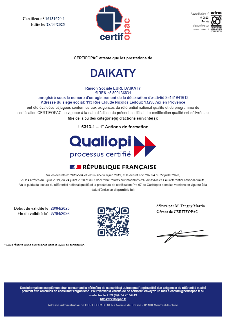 Tous nos formateurs utilisent les contenus, les supports, les outils et la pédagogie DAIKATY.